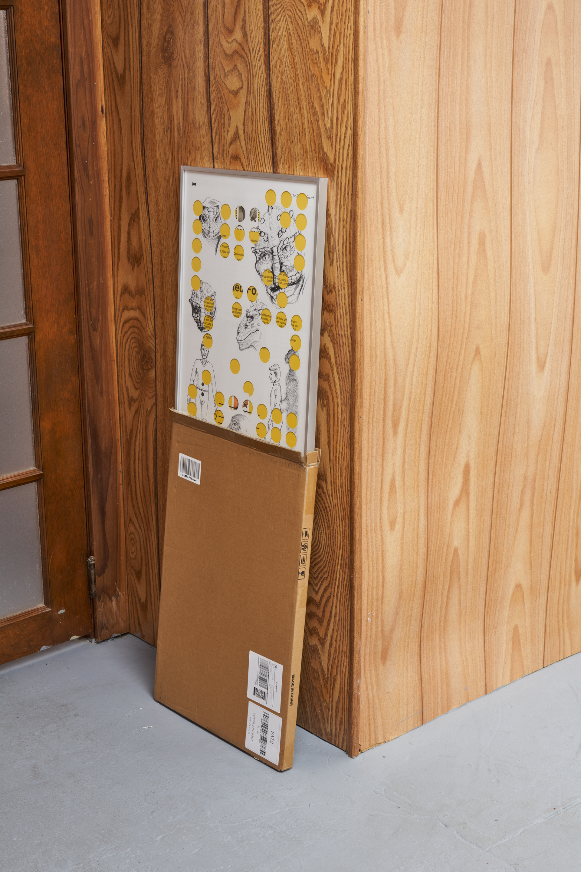 Within Mystic Cachet Bandy and Jackson use community generated suggestions for tracking the Schuylkill Note creator as formal cues for the production of this work. A recurring motif of sporadically shifting holes unites works in the exhibition, derived from Machine Identification Codes–imperceptible dot matrices of code unbeknownst to most, printed in yellow ink on nearly any printed document. Both a formal choice and a practical one, these codes provide a timestamp for when and how these artworks were produced. Likewise trailcam photographs line architectural features of the gallery, documenting an anonymous individual pinning notes on trees. Outside the gallery a decoy parcel containing a trailcam is activated during open hours or appointments, indexing visitors’ presence at the gallery. Additionally, a boot print stamping device–devised by the artists–considers the idea of tracing the note-distrubutor through footprints they might leave behind.